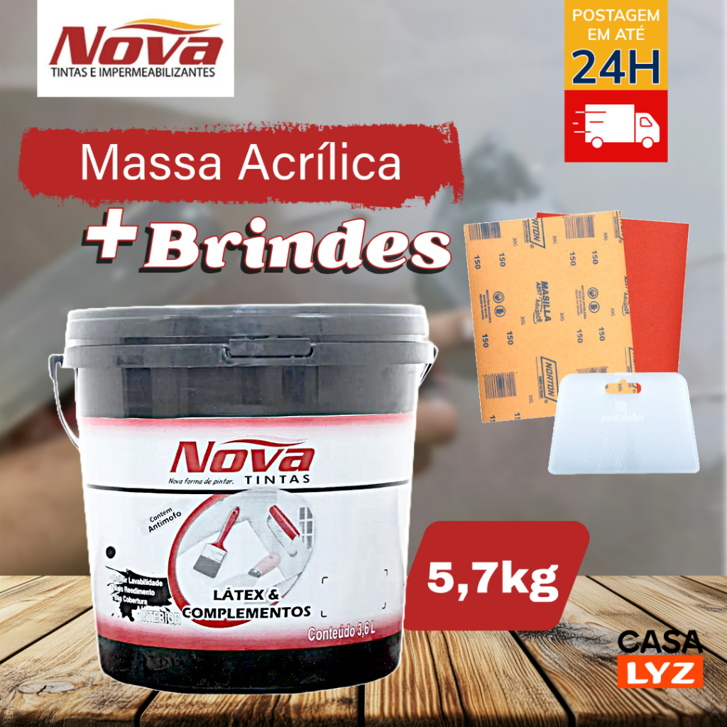 Com a MASSA ACRÍLICA NOVA TINTAS você nivela e corrige imperfeições rasas em superfícies externas e internas, em geral. Deixa a superfície lisa, proporcionando uma pintura com acabamento perfeito. É um produto fácil de aplicar e de lixar, que apresenta grande resistência às ações do tempo e à alcalinidade, apresentando rendimento superior, elevada consistência e grande poder de enchimento.